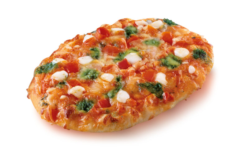 La pizza classique garnie de boules de mozzarella juteuses, de morceaux de tomates bien mûres et d’une pointe de pesto vert.