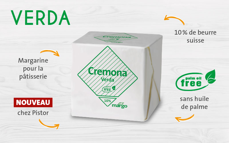 De la graisse de noix de coco délicatement fondante associée à de l’huile de colza locale et un supplément de beurre suisse font de Cremona Verda 10 % la star des margarines de pâtisserie: