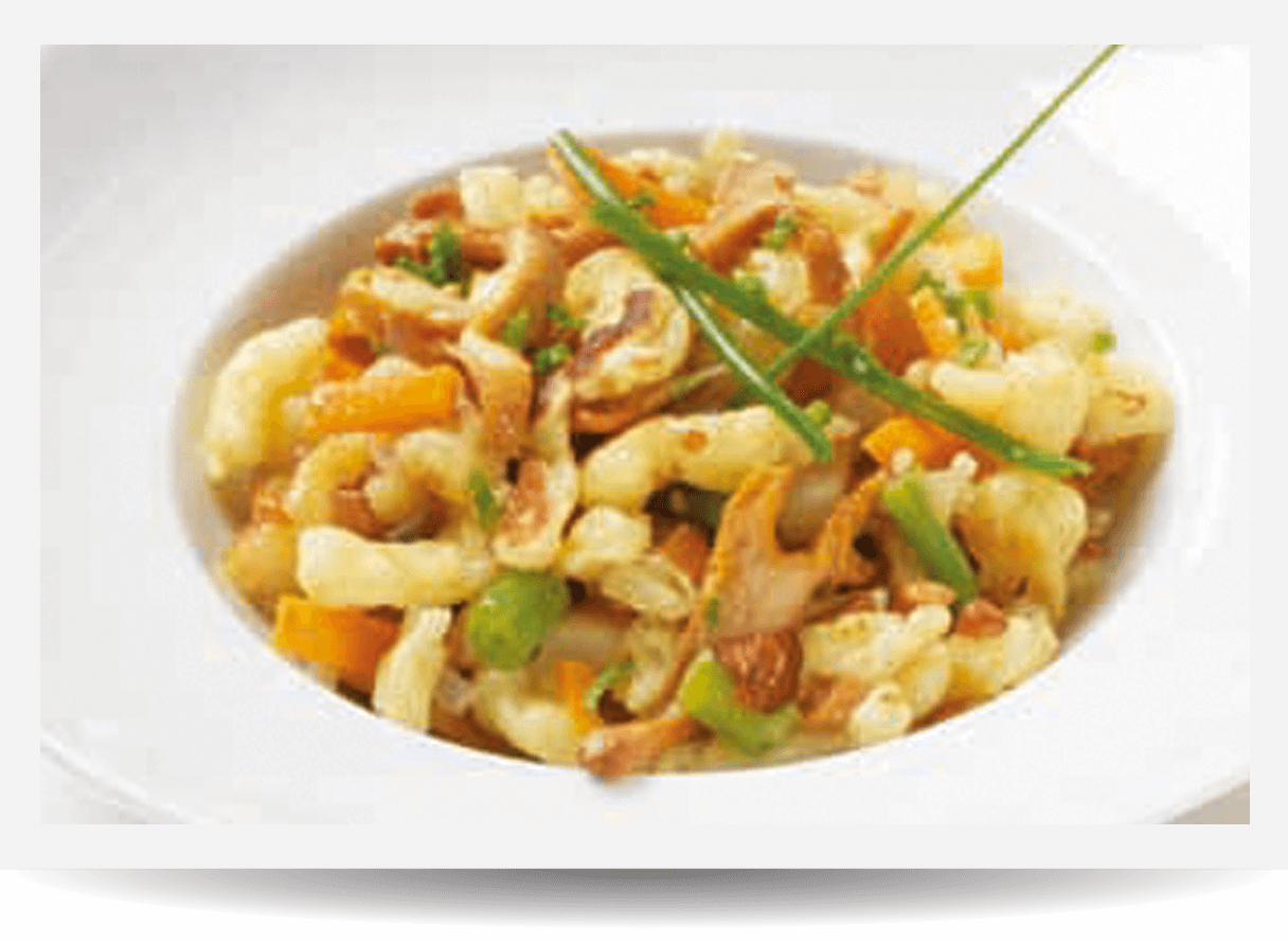Faire revenir brièvement les chanterelles dans le DELISSIO Gold 10%, ajouter les légumes et étuver. Ajouter les spätzlis, arroser de DELISSIO Gold et faire encore revenir brièvement.